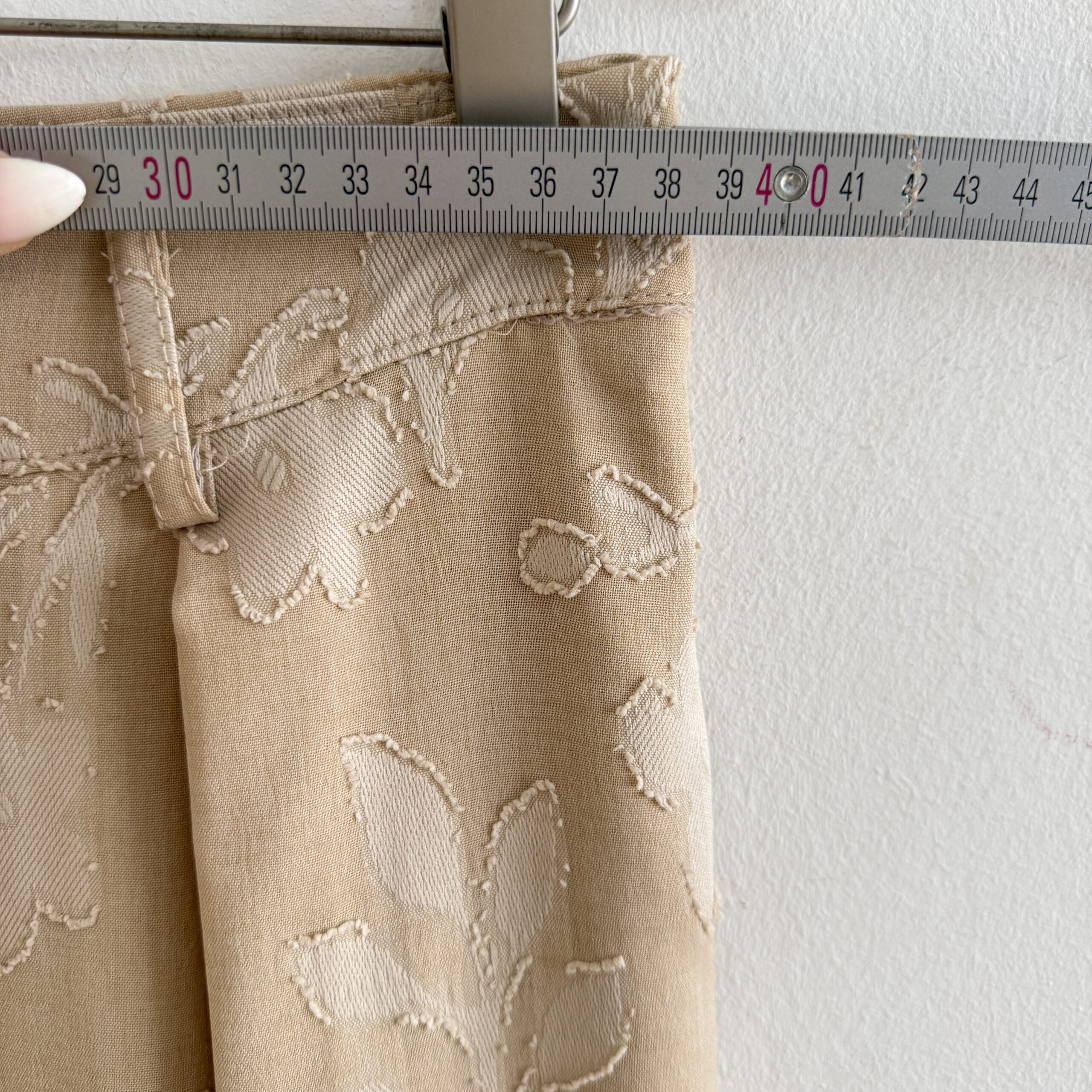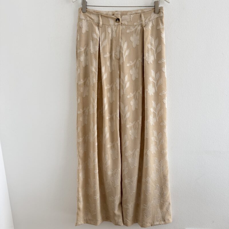 Leichte Frühjahr-Sommerhose in elegantem Beige mit zarten 3D-Blumen- und Blätterdetails. Der knitterfreie Stoff sorgt für einen gepflegten Look den ganzen Tag, während die Kellerfalte vorne und der klassische Reißverschluss für eine stilvolle Silhouette sorgen. Ideal für warme Tage und vielseitig kombinierbar.