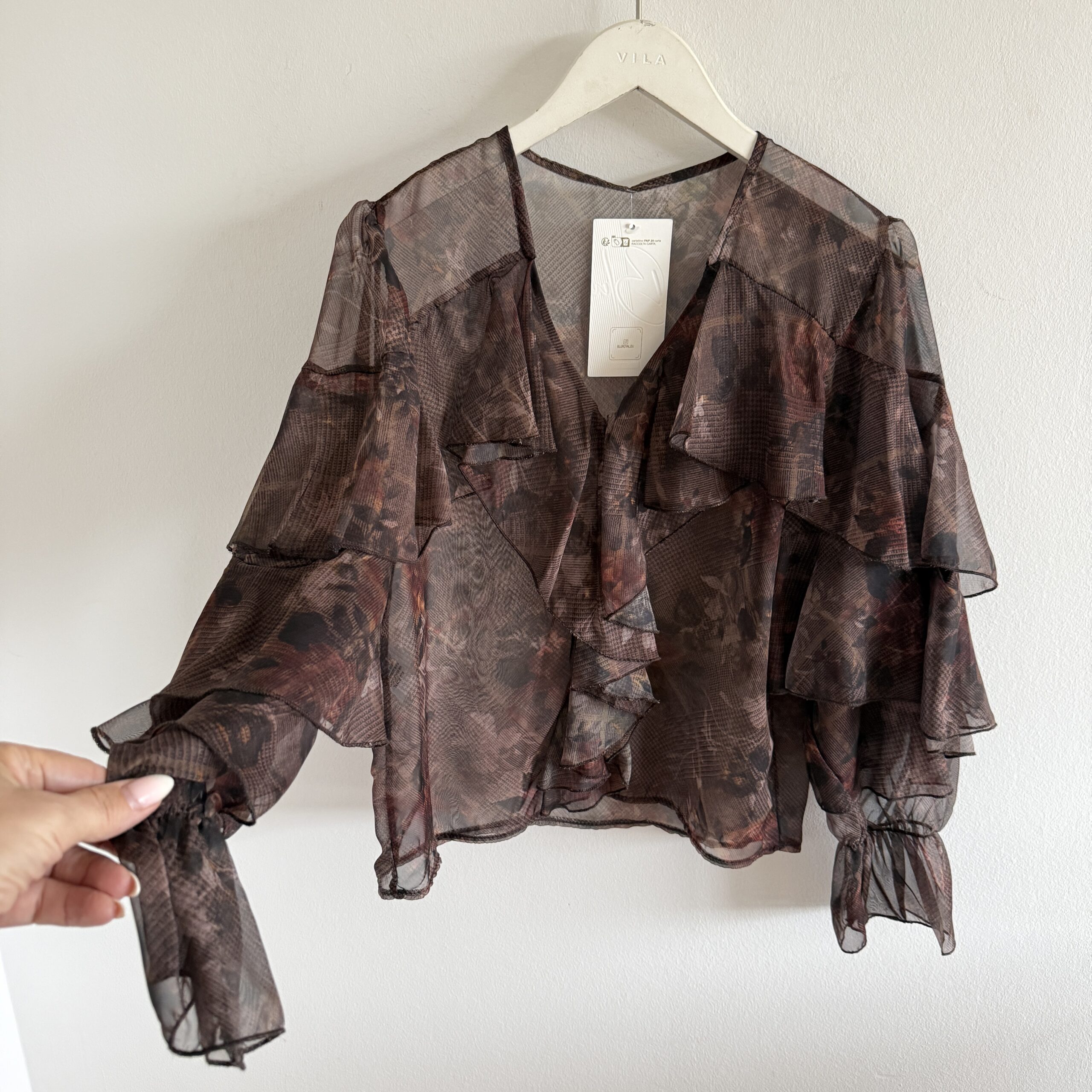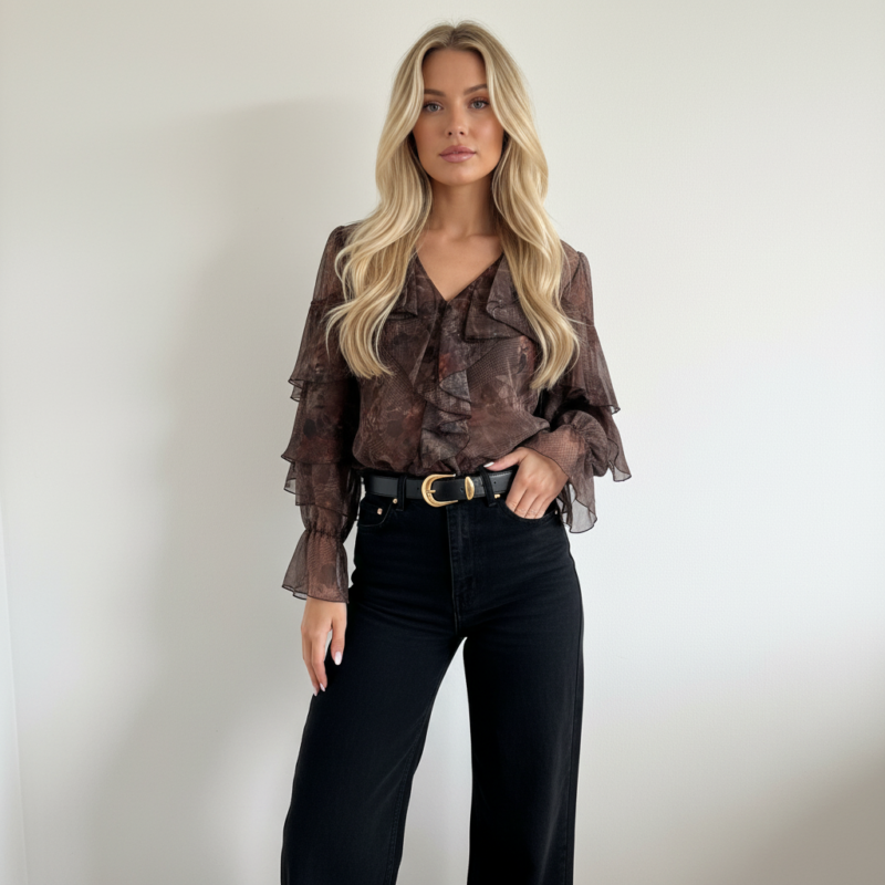 Leichte, zart transparente Rüschbluse mit Volants an den Ärmeln und femininem V-Ausschnitt. Fließender Stoff sorgt für einen eleganten Fall – perfekt für Frühling & Sommer.