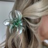 • Design: Die Haarspange hat die Form einer Blume und ist aus transparentem Material gefertigt, das einen irisierenden Schimmer aufweist.