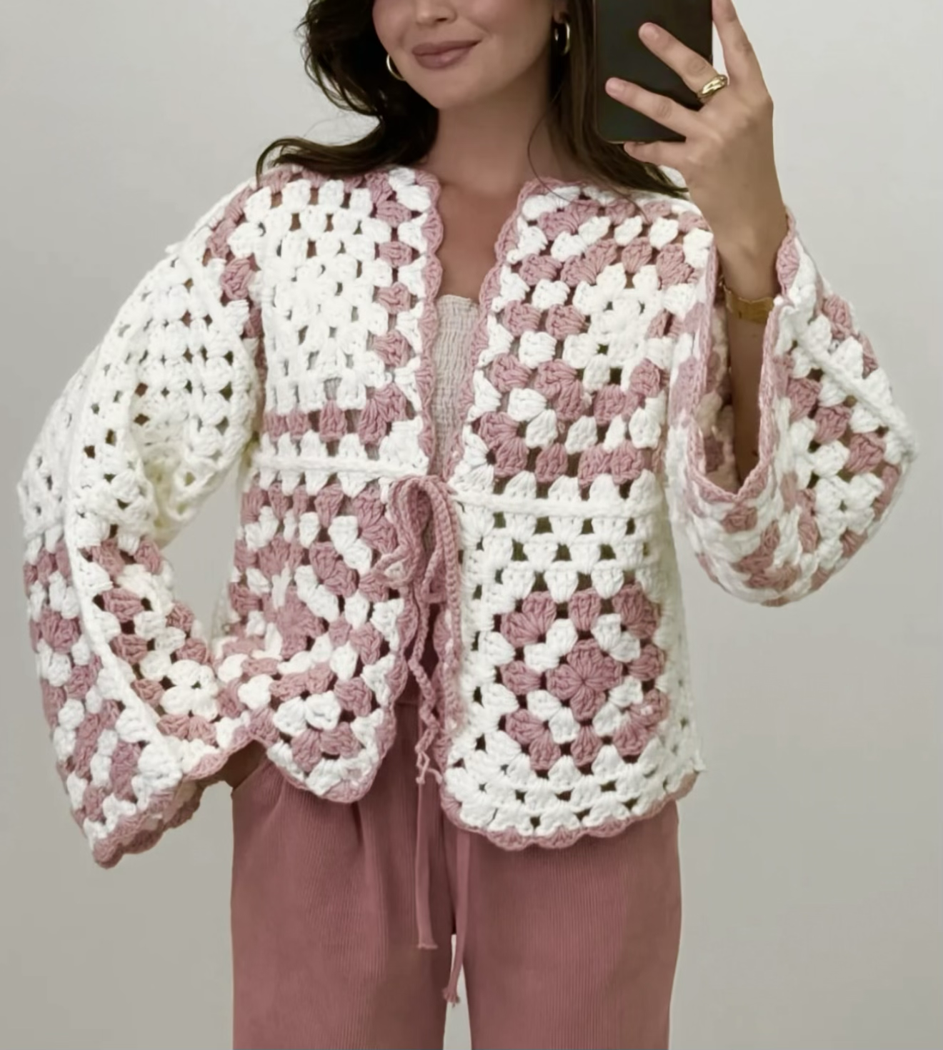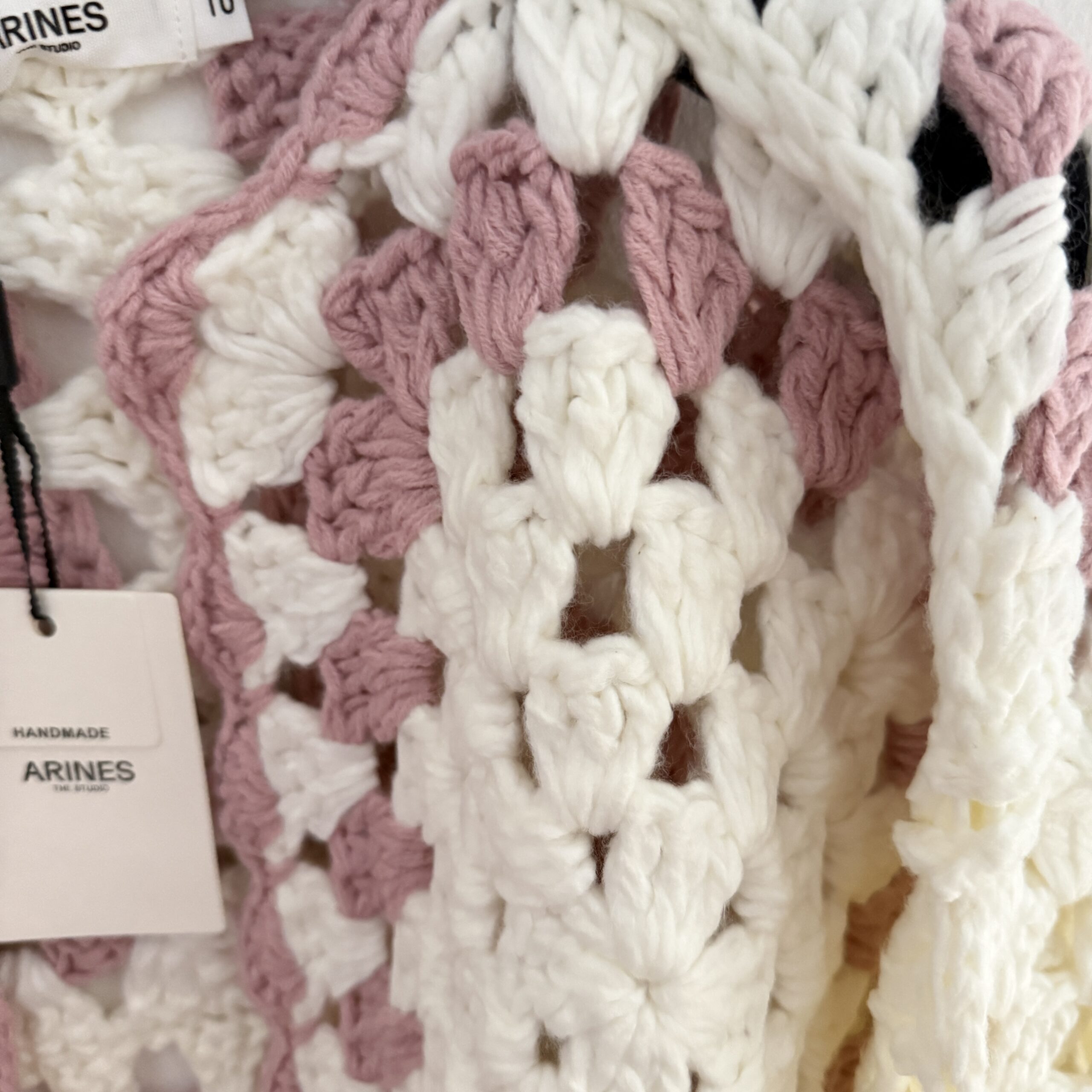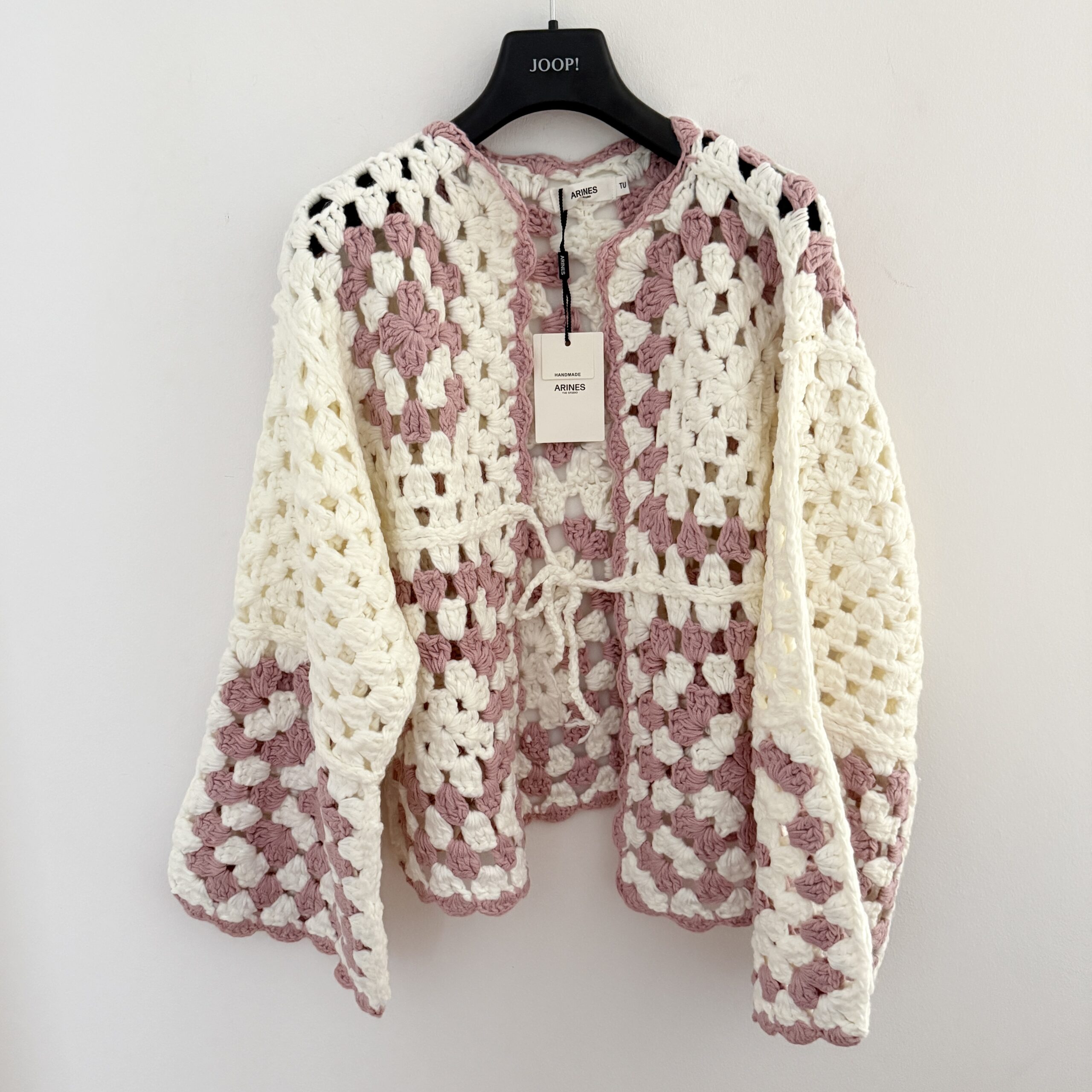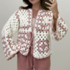 Ein einzigartiger, handgefertigter Cardigan aus hochwertigem Garn. Lockerer Schnitt, angenehm zu tragen und vielseitig kombinierbar. Das offene Häkelmuster in Creme- und Rosétönen verleiht dem Stück einen romantischen, boho-inspirierten Look.