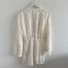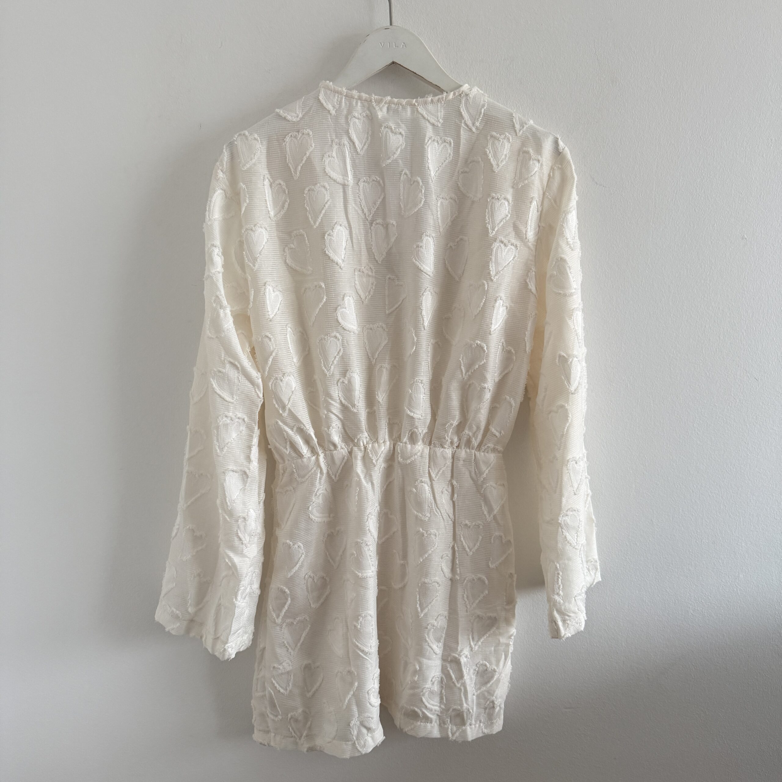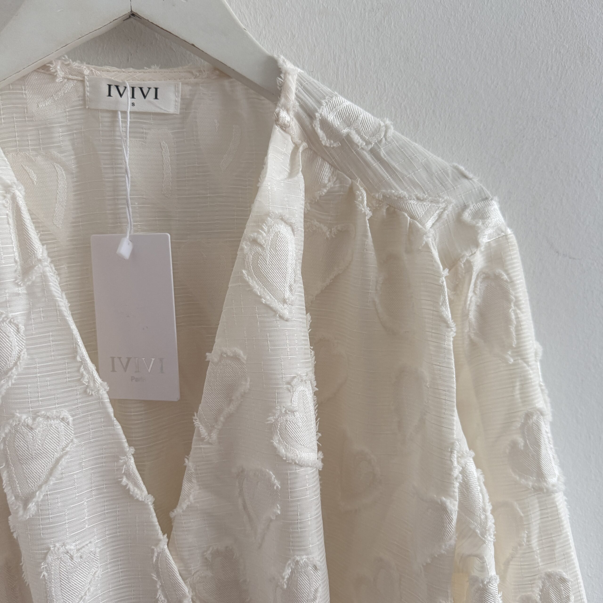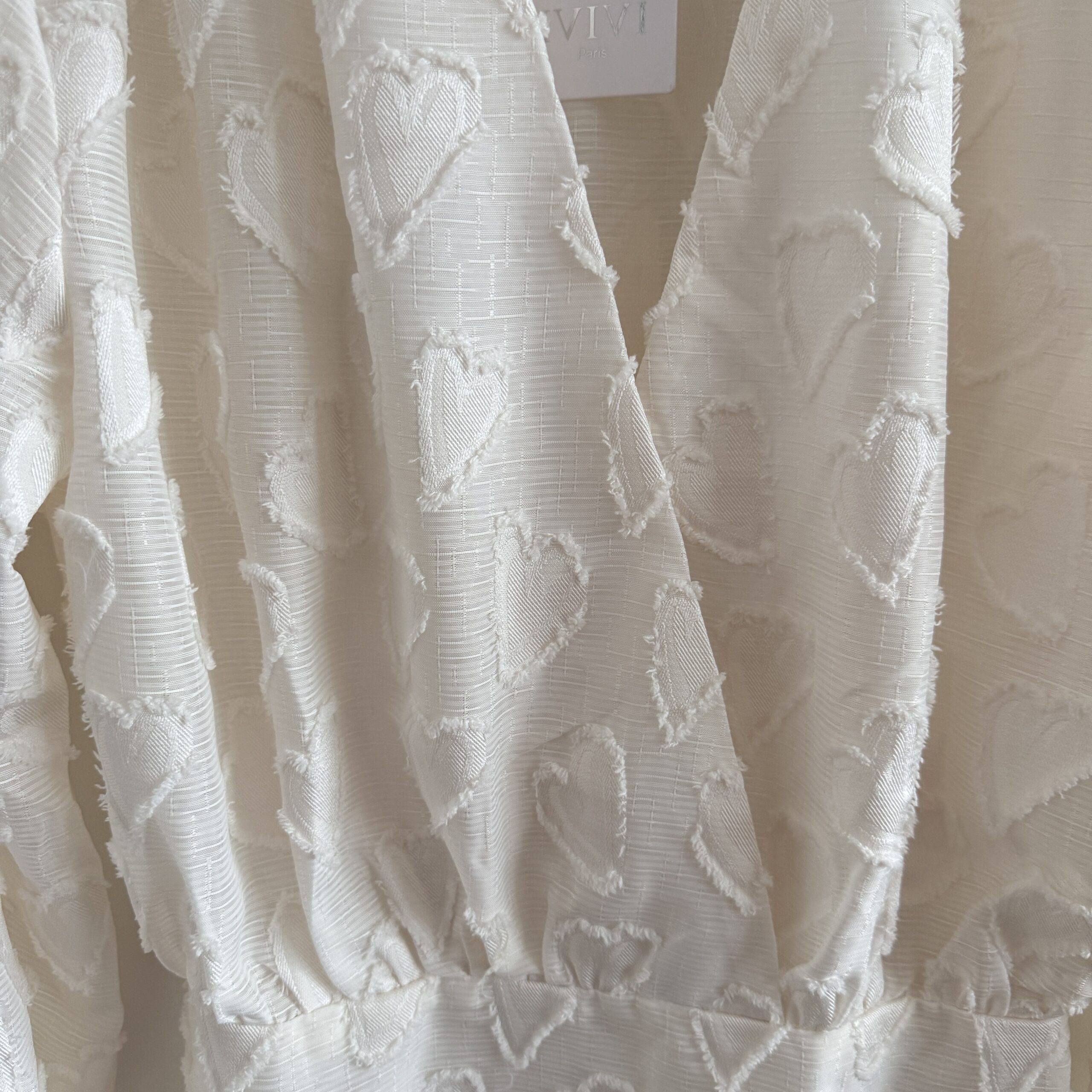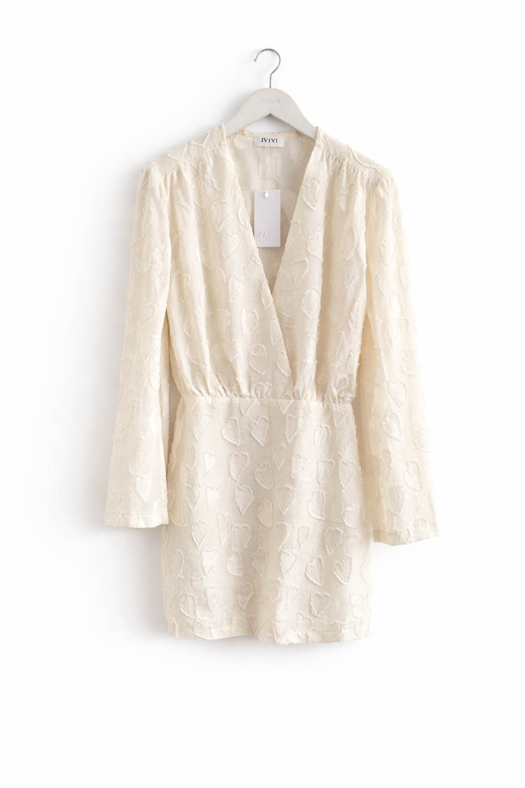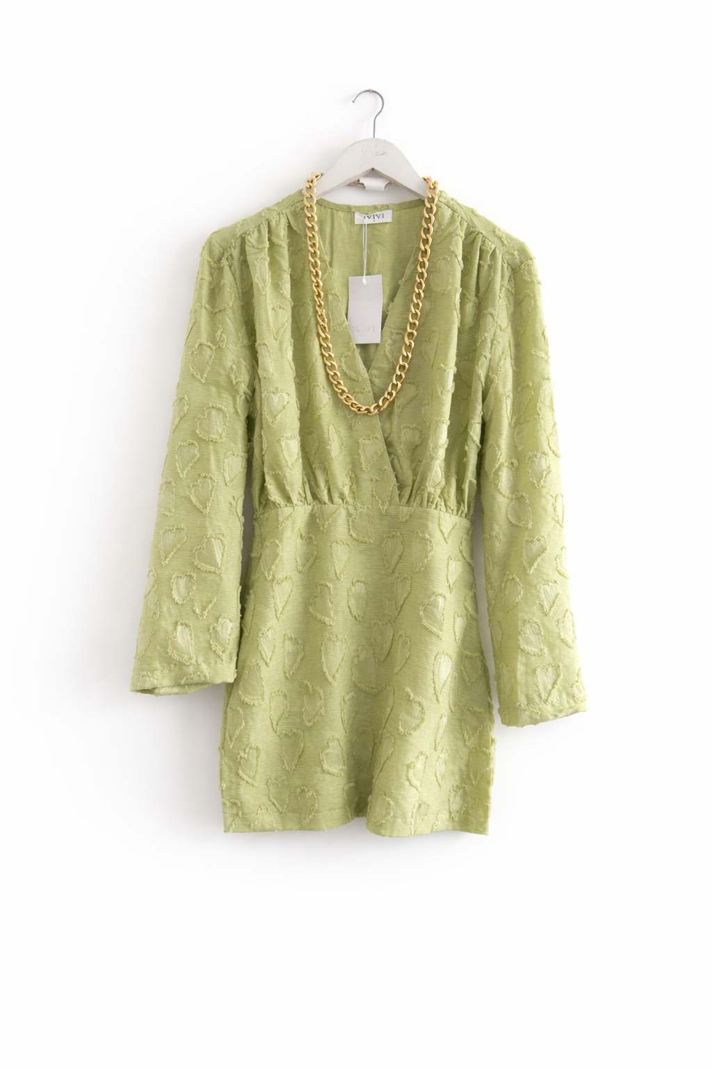 Romantisches Kleid aus strukturierter Qualität mit eingewebtem Herzmuster. Der feminine V-Ausschnitt und die leicht betonte Taille sorgen für eine schmeichelhafte Silhouette. Die langen Ärmel und der weiche, fließende Stoff machen das Kleid zu einem stilvollen Begleiter für besondere Anlässe oder elegante Alltagslooks.