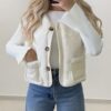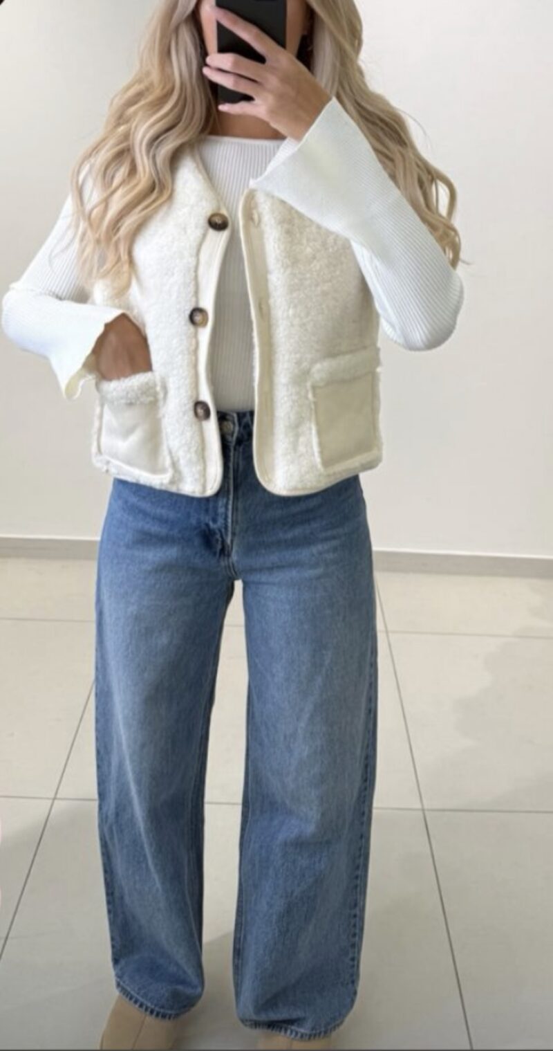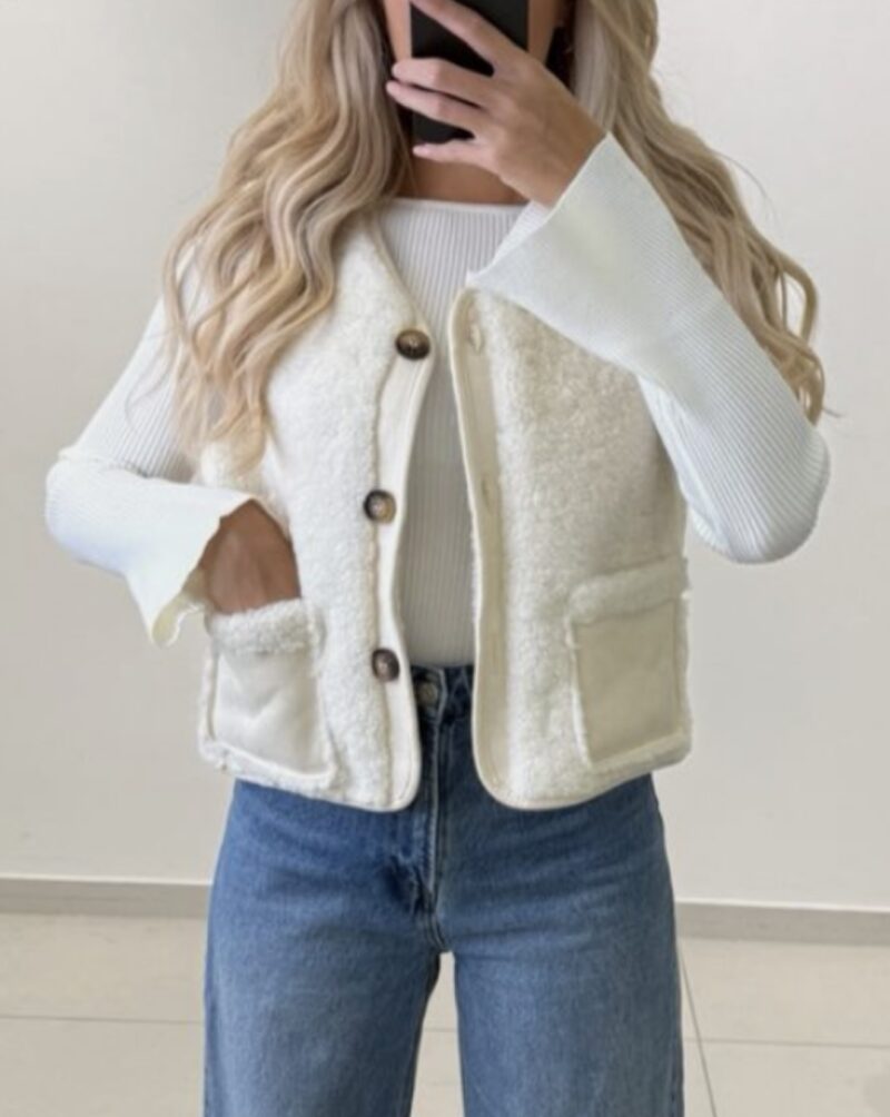 Diese stylische Teddyweste verleiht jedem Outfit eine gemütlich-elegante Note. Das weiche, flauschige Material sorgt für angenehmen Tragekomfort, während die kontrastierenden Knöpfe und aufgesetzten Taschen das Design perfekt abrunden. Ideal zum Überziehen über Longsleeves, Pullover oder Blusen – perfekt für kühle Tage und trendige Layering-Looks.