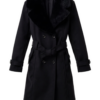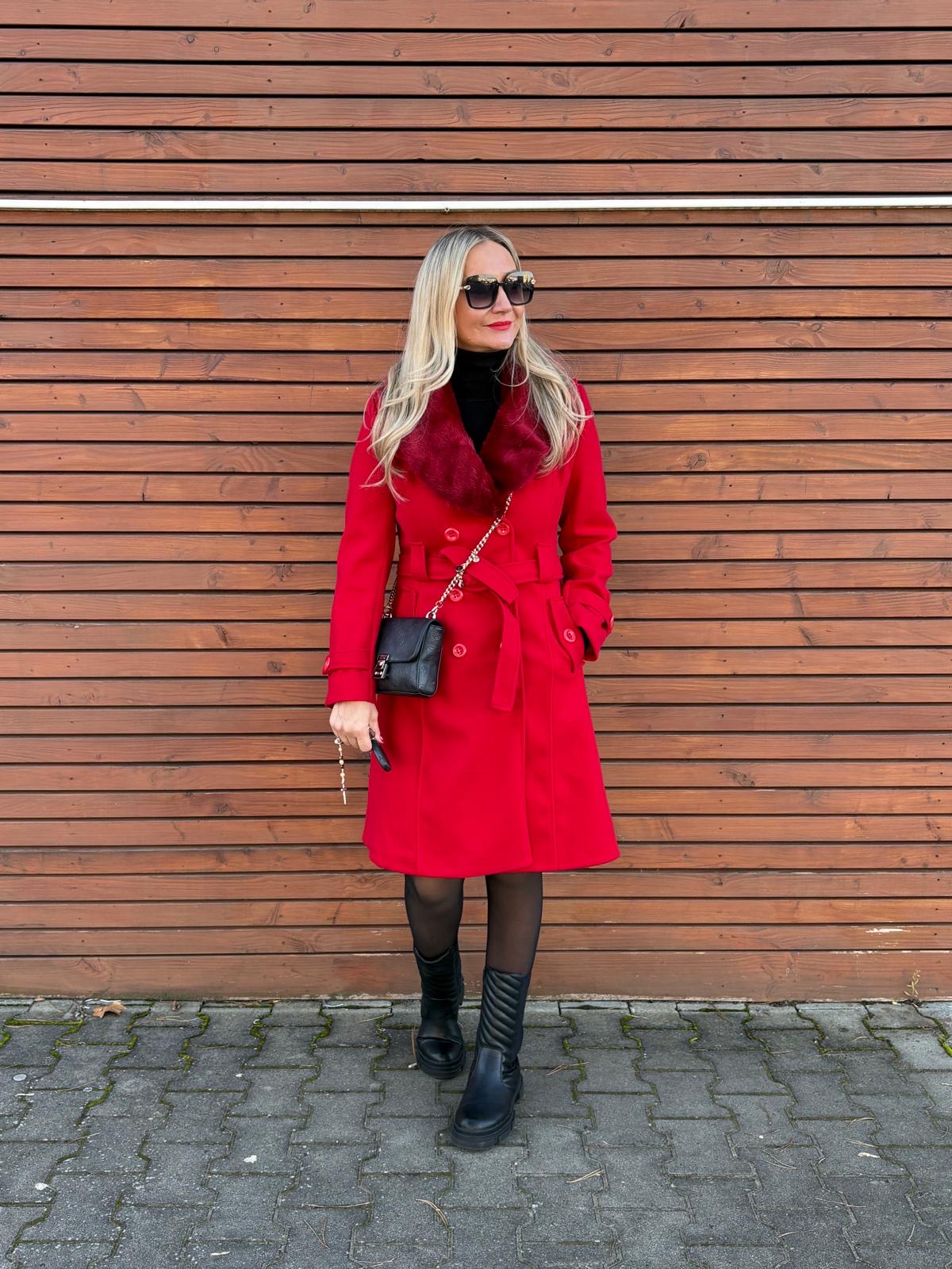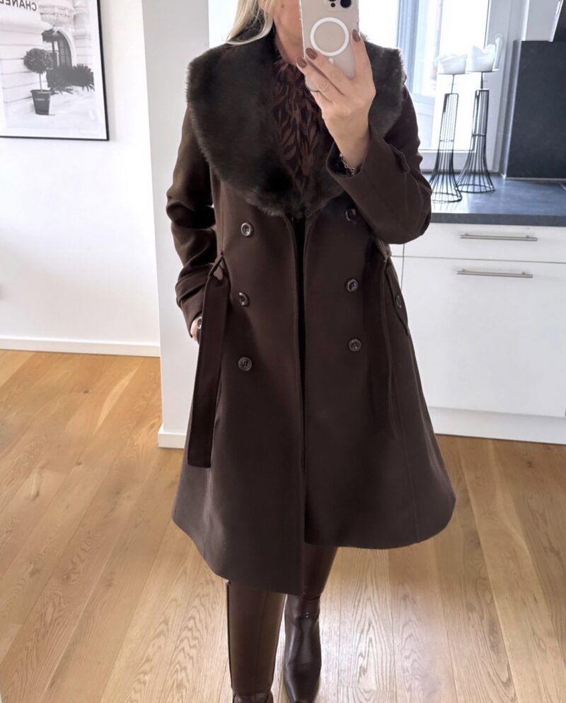 Dieser stilvolle, mittel-lange Mantel in einem edlen Schokobraun und Schwarz überzeugt durch sein elegantes Design und hochwertige Verarbeitung. Der leicht taillierte Schnitt mit doppelreihiger Knopfleiste und Bindegürtel zaubert eine feminine Silhouette. Ein besonderes Highlight ist der abnehmbare Kunstfellkragen, der mit kleinen Knöpfen befestigt ist und je nach Anlass für einen variablen Look sorgt. Seitentaschen bieten praktischen Komfort, während das seidige Innenfutter ein angenehmes Tragegefühl verleiht. Perfekt für stilvolle Auftritte an kühleren Tagen.