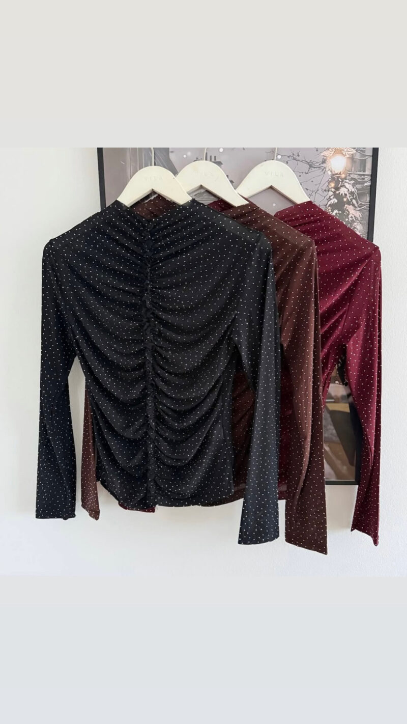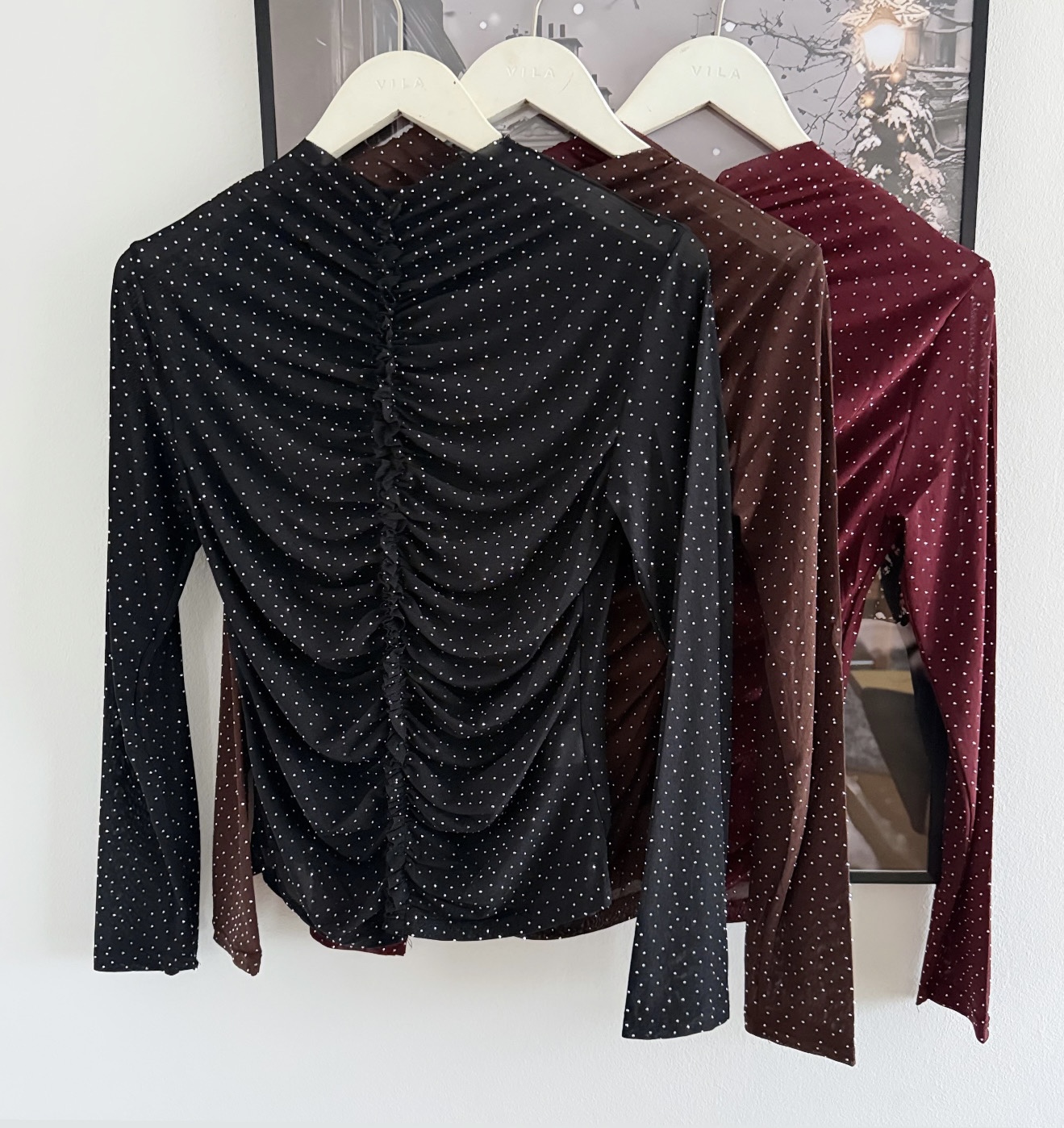 Elegantes, super feines transparentes Oberteil aus weichem Stretchmaterial. Das Top schmiegt sich angenehm an die Haut an und bietet durch seine Einheitsgröße eine flexible Passform von XS bis L. Funkelnde Glitzersternchen verleihen dem Oberteil einen besonderen, festlichen Look. Die mittige Raffung sorgt für eine schöne Silhouette und setzt das Dekolleté dezent in Szene – perfekt für Party-Outfits, besondereAnlässe oder als glamouröses Fashion-Statement.