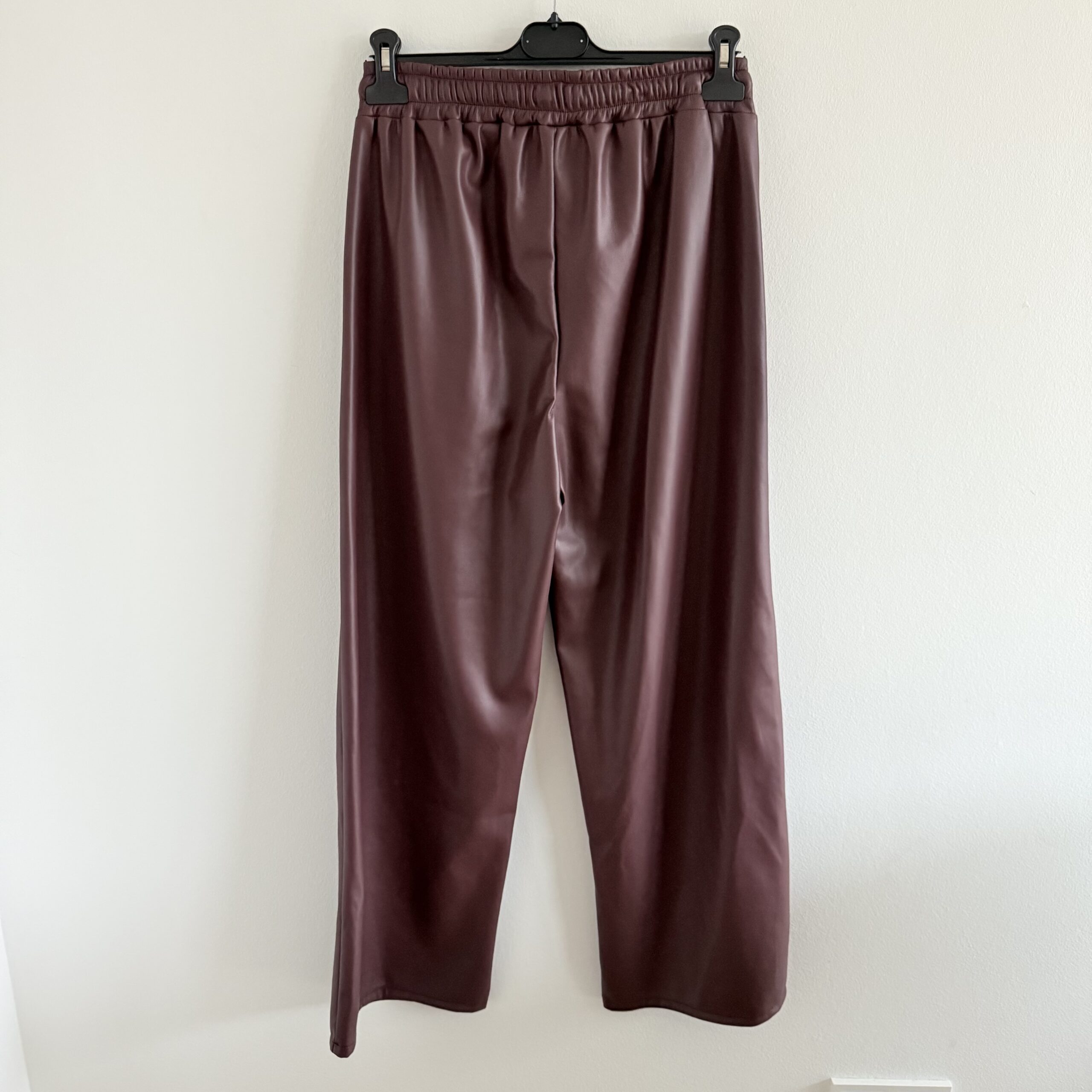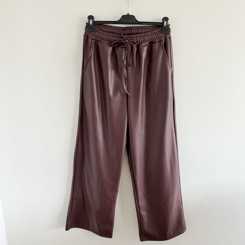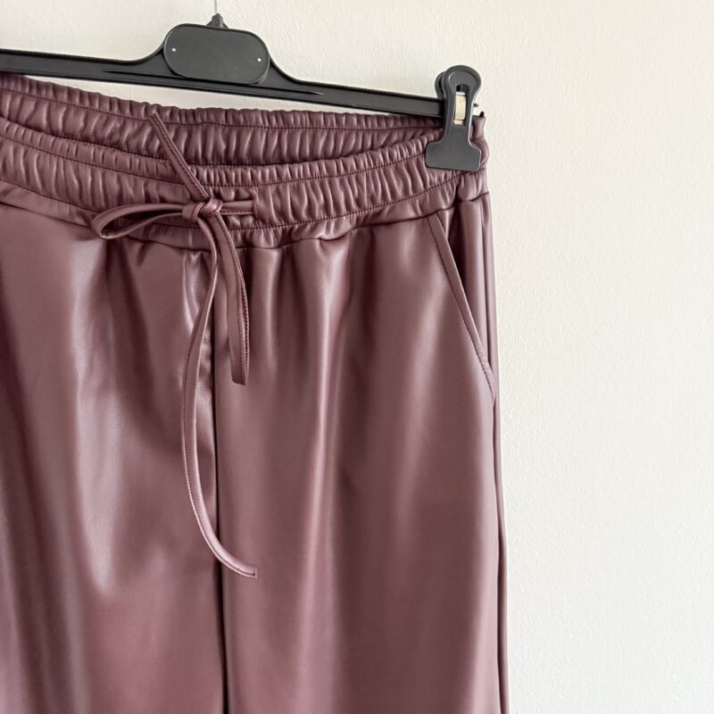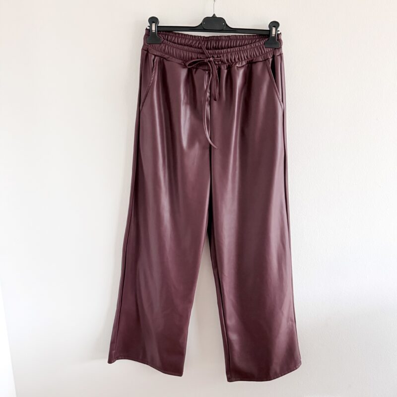 Stylische, lässige Hose aus veganem Leder mit isolierender Innenseite – ideal für kühle Tage. Der weite Bein-Schnitt und die hohe Leibhöhe mit Bindegürtel sorgen für eine moderne, bequeme Passform. Seitliche Schlupftaschen runden den Look ab – perfekt für viele Anlässe.