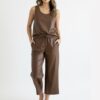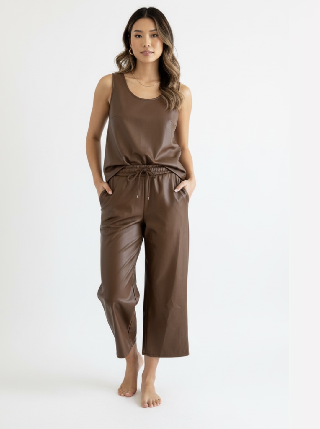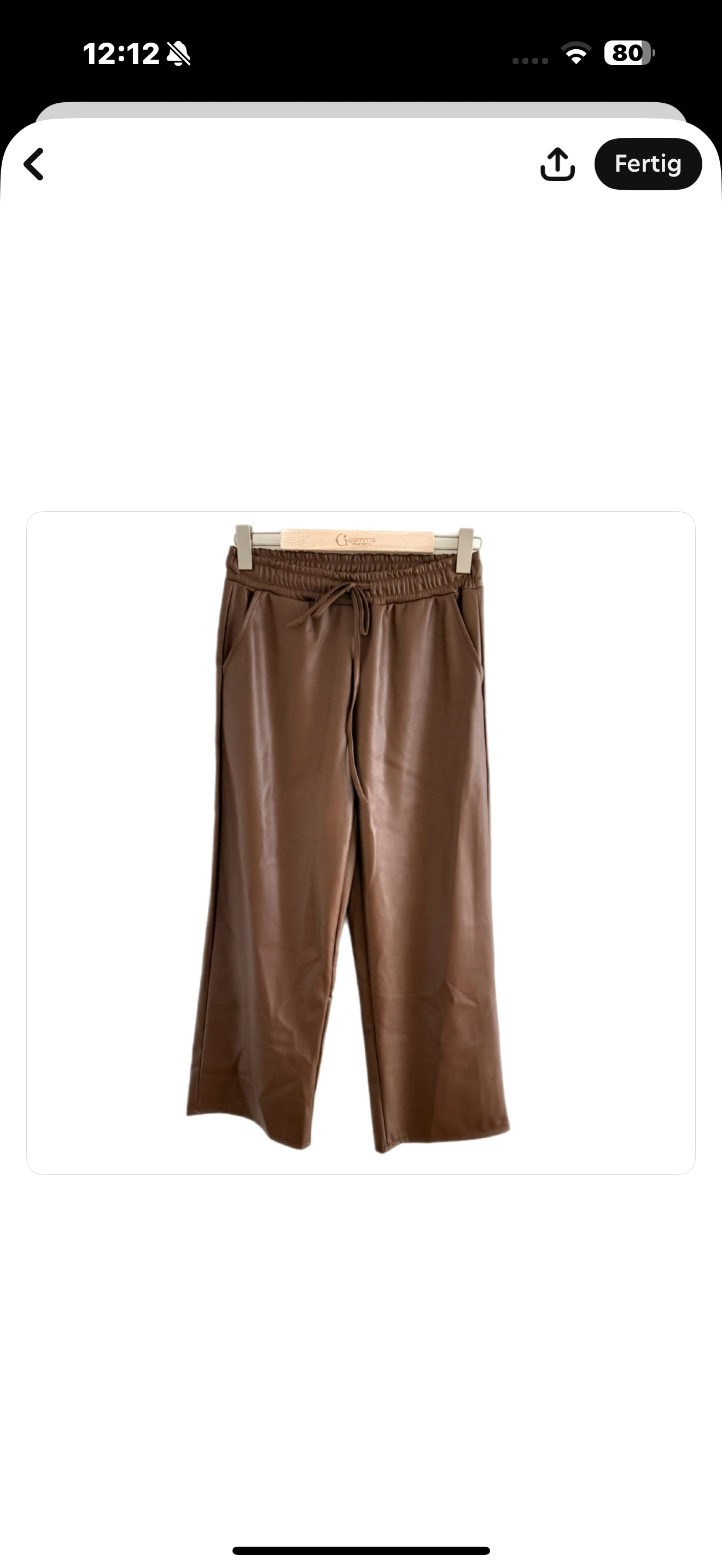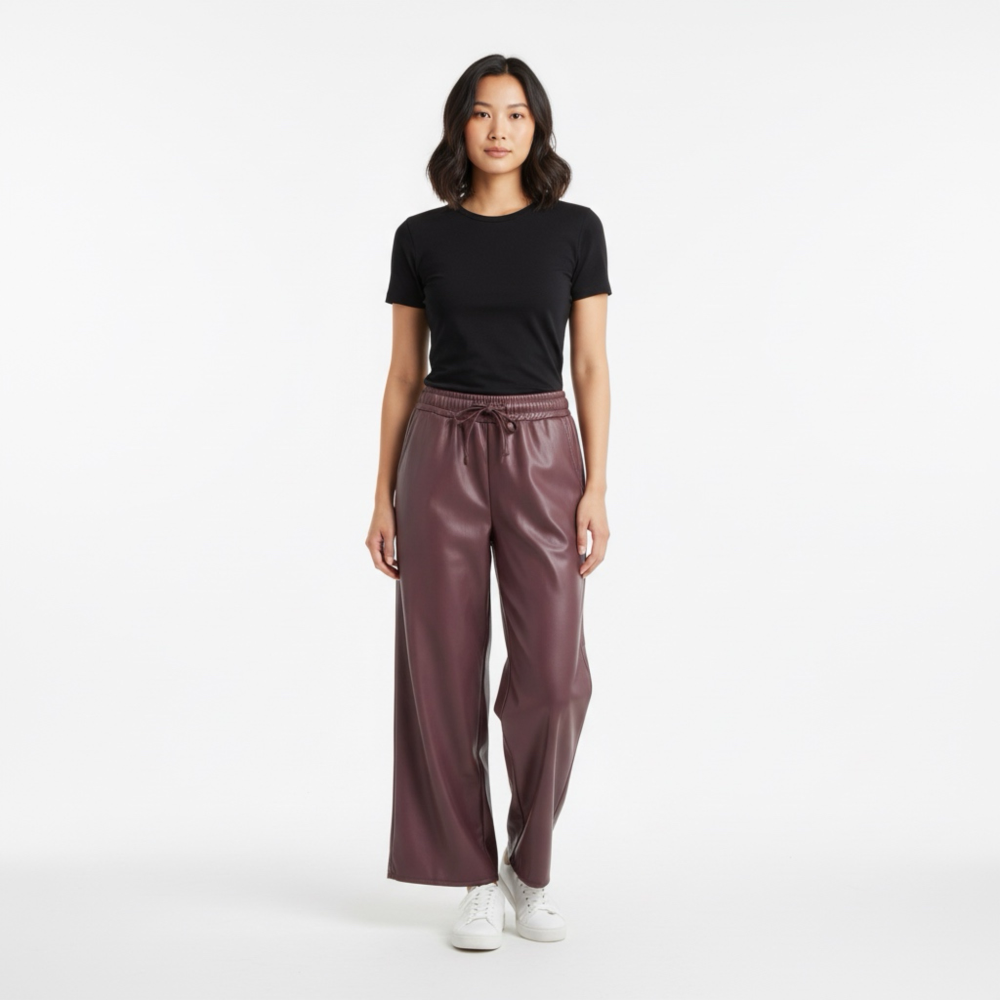 Stylische, lässige Hose aus veganem Leder mit isolierender Innenseite – ideal für kühle Tage. Der weite Bein-Schnitt und die hohe Leibhöhe mit Bindegürtel sorgen für eine moderne, bequeme Passform. Seitliche Schlupftaschen runden den Look ab – perfekt für viele Anlässe.