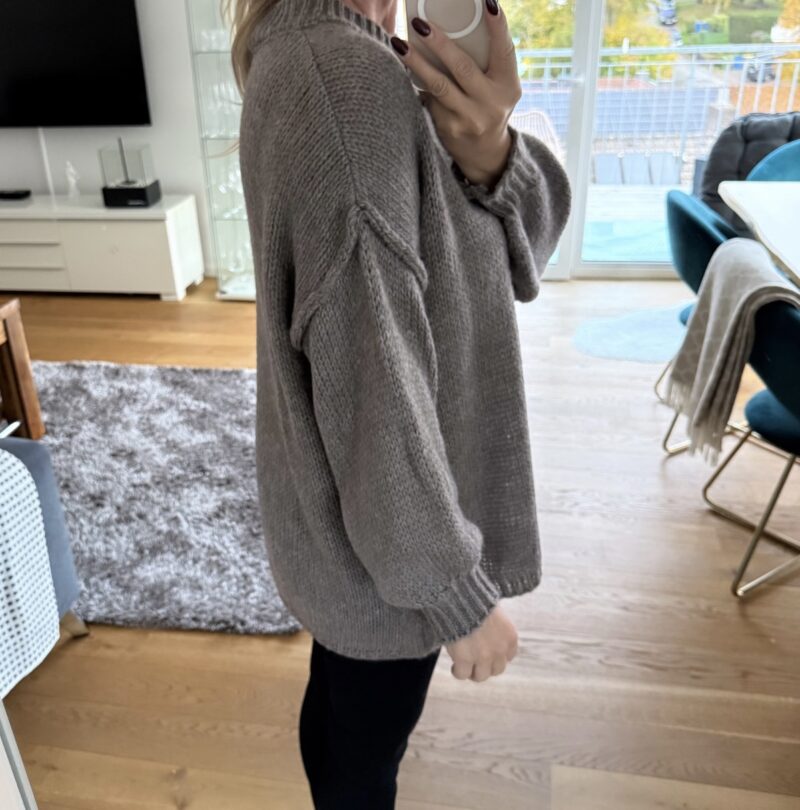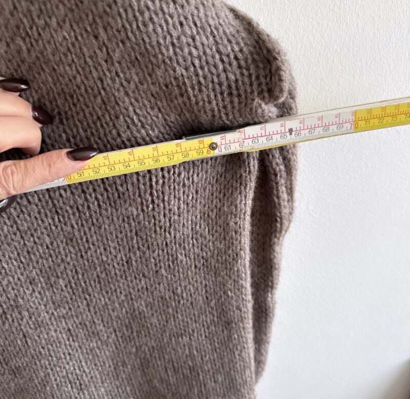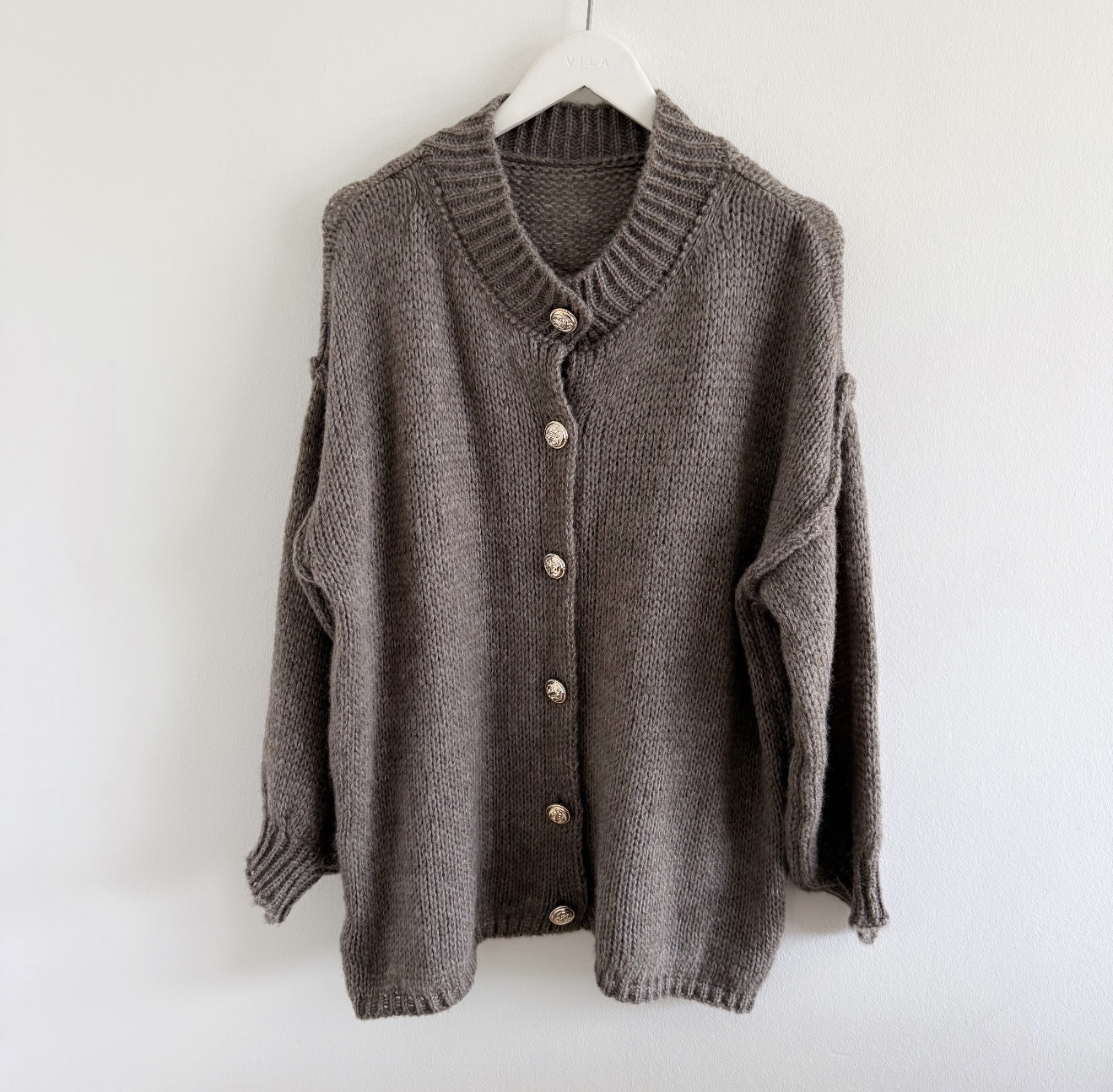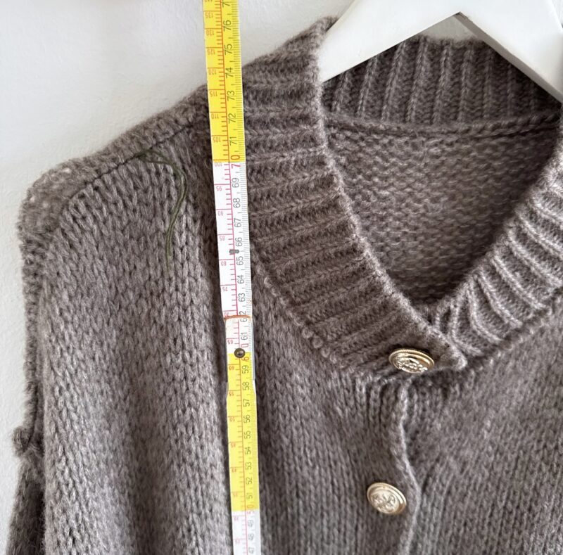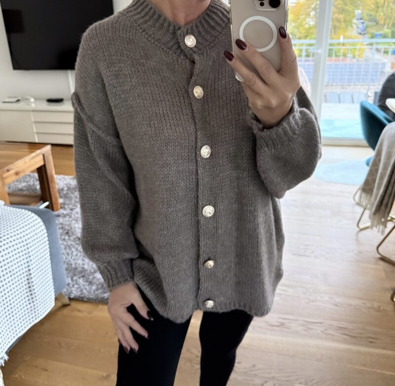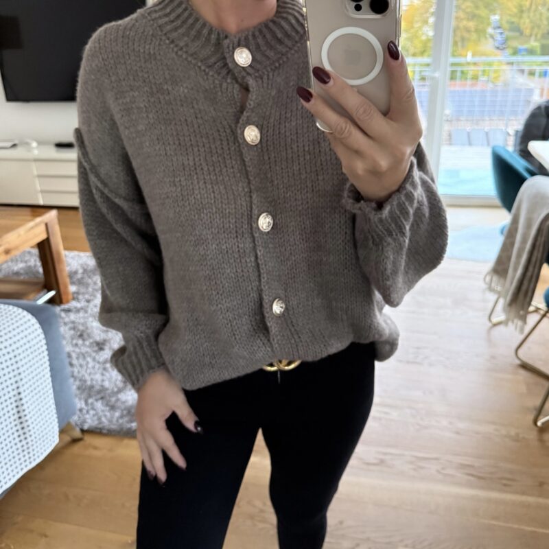 Leichte, dünn gestrickte Strickjacke in elegantem grau-bräunlichen Ton mit goldenen Knöpfen. Einheitsgröße passt von XS bis L. Maße: Achsel zu Achsel 63 cm, Länge 74 cm