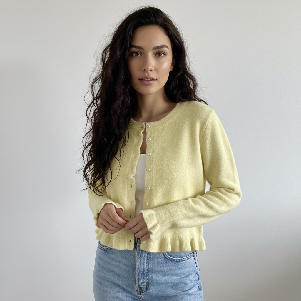 Ob lässig oder elegant kombiniert – diese Strickjacke setzt jedes Outfit stilvoll in Szene. Model Bilder sind durch eine KI App erstellt.