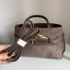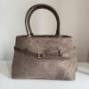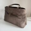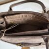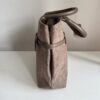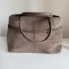 Elegante taubbraune Umhängetasche in mittlerer Größe mit goldenen Details. Unten breiter (39 cm) und oben schmaler (31 cm), Länge 25 cm, Tiefe 10 cm. Aus weichem samtartigen Stoff und Veganleder, mit Handhänkel und abnehmbarem Umhängegurt. Innen mit Reißverschluss-Seitentasche, außen oben ebenfalls mit Reißverschluss. Stilvoll, praktisch und vielseitig.